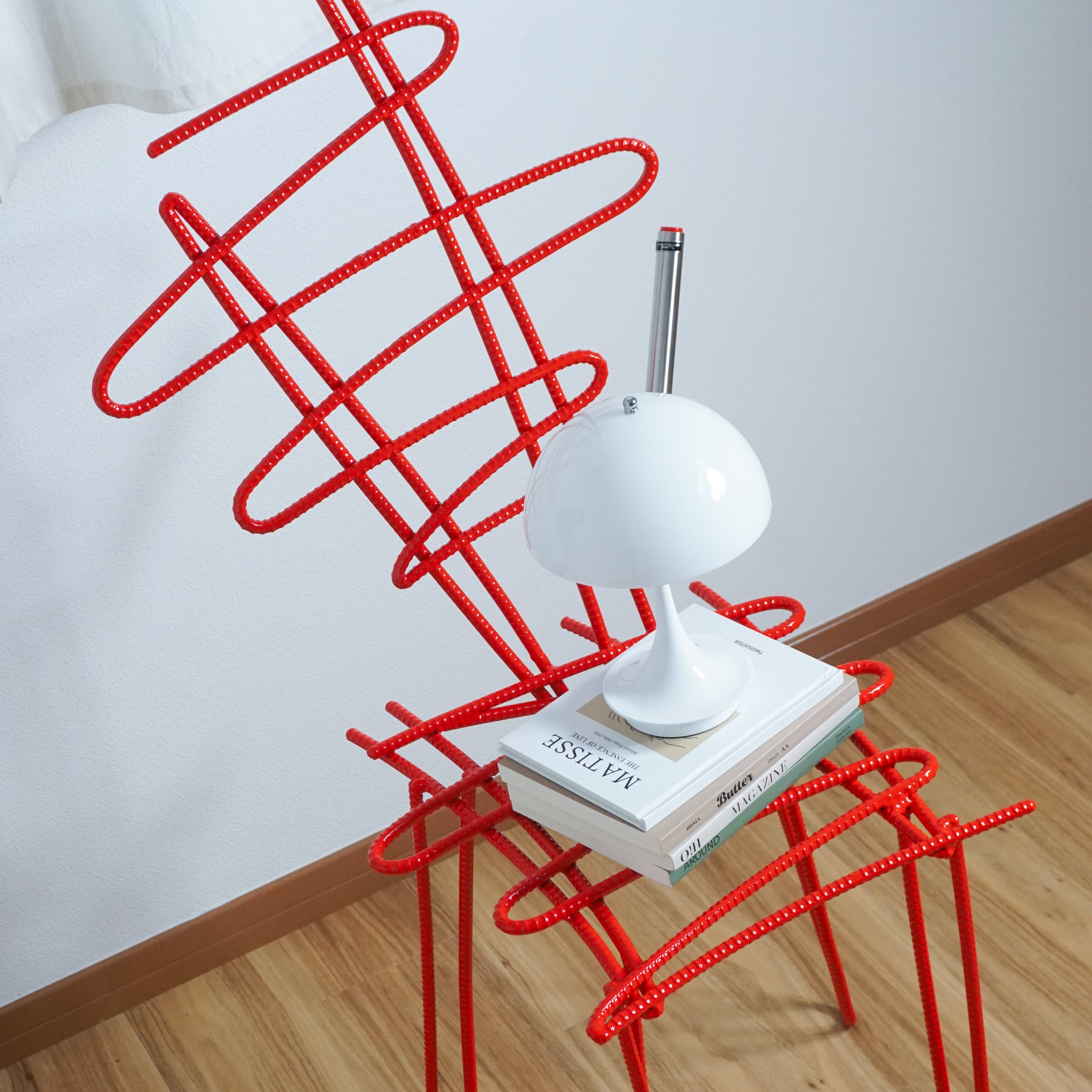 インテリアの素材としては珍しい異形鉄筋を採用し、表面の凹凸と鮮やかなカラーで、手描きの線のラフなニュアンスを表現。