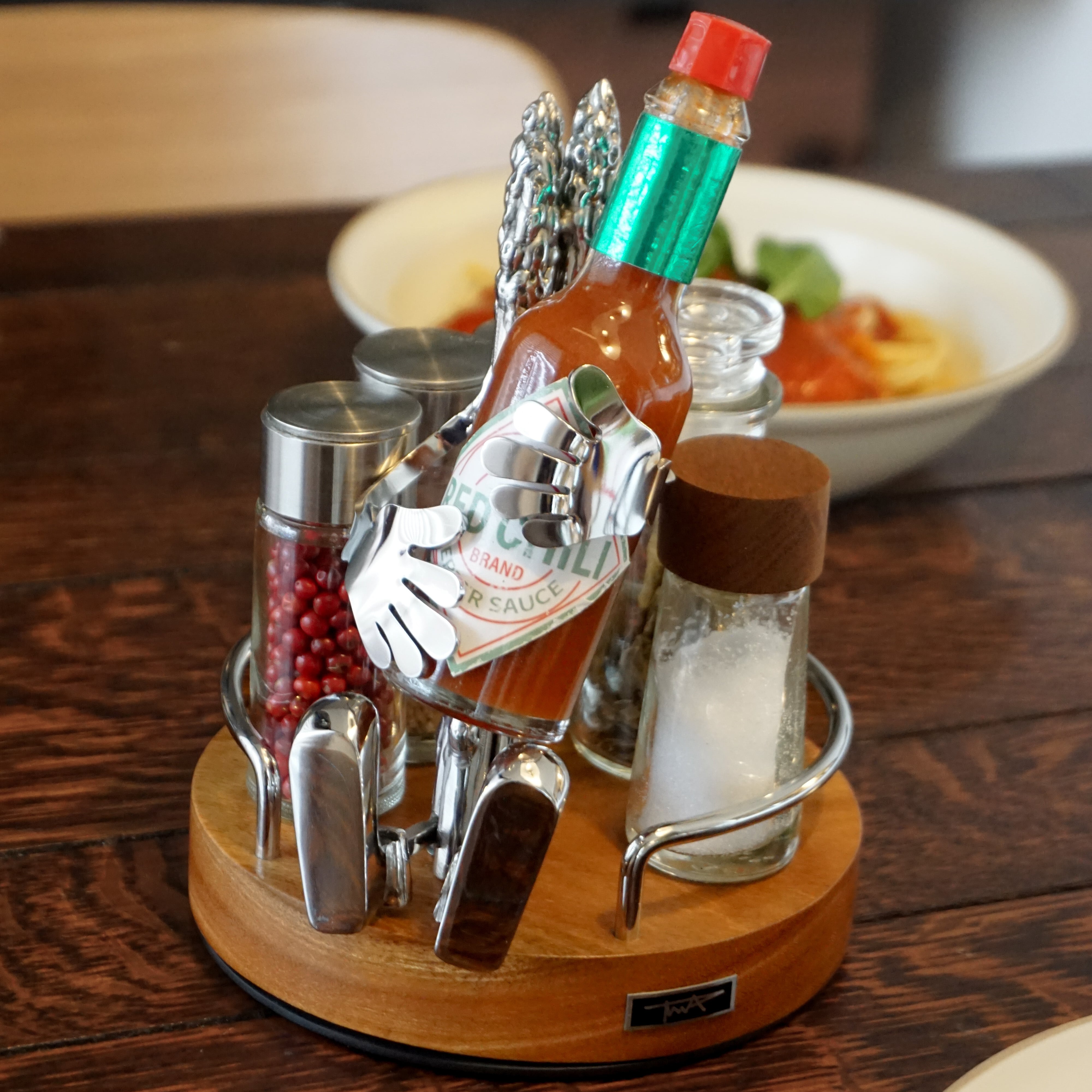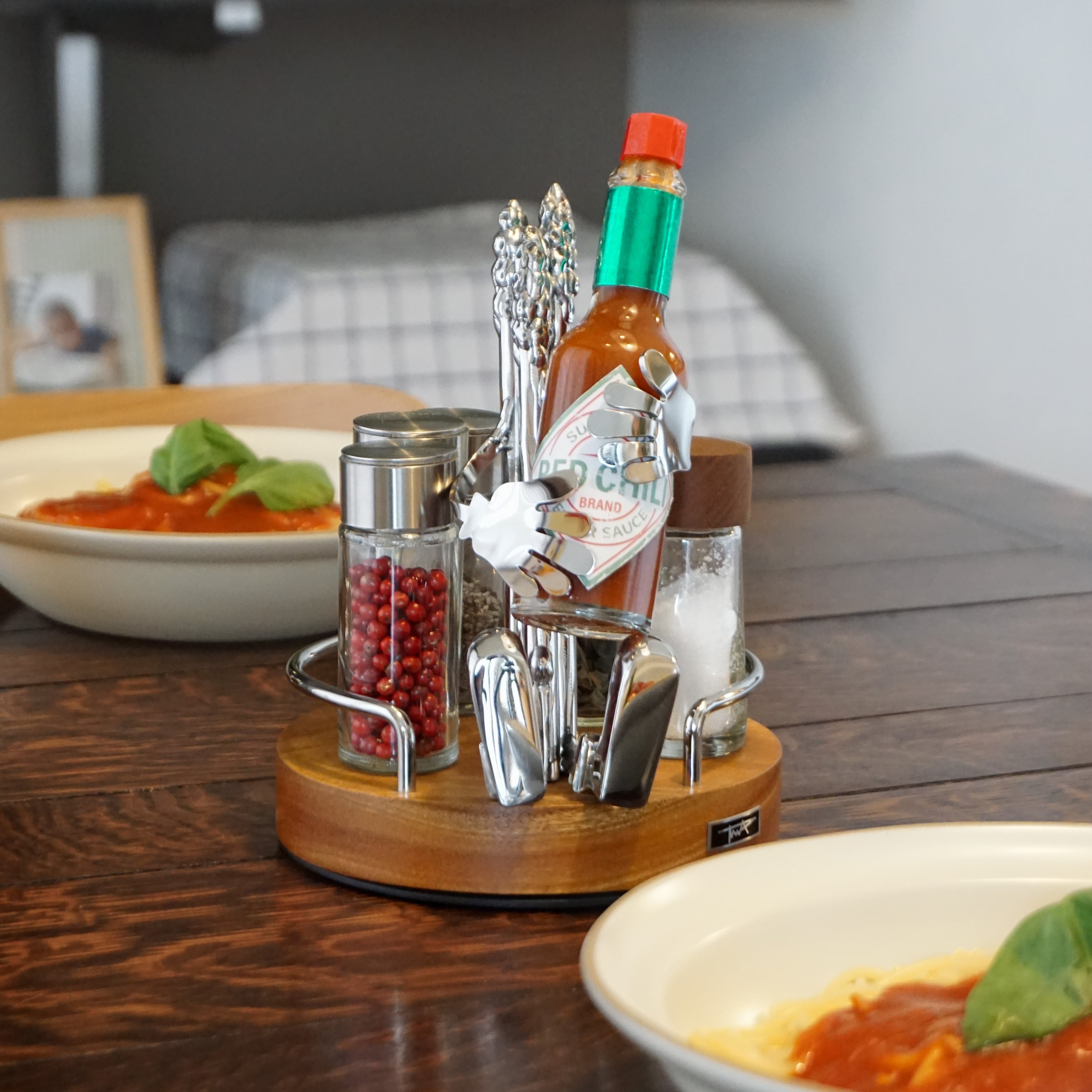 回転台座の上でスパイスボトルを大事に抱えるアスパラガスの姿がかわいらしく、ユーモラスなデザイン。料理の時間や食卓でのひとときを、ほんの少し楽しく、心あたたまるものにしてくれます。その愛らしい佇まいは、目にした人が思わず話題にしたくなるような存在感があり、ゲストとの楽しい会話のきっかけにもなるでしょう。